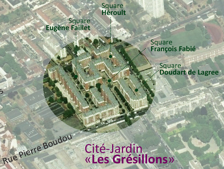 Le site doit être résidentialisé et les six squares paysagers requalifiés. Les espaces extérieurs sont recomposés pour favoriser le végétal en transformant notamment des surfaces minérales en jardins partagées.