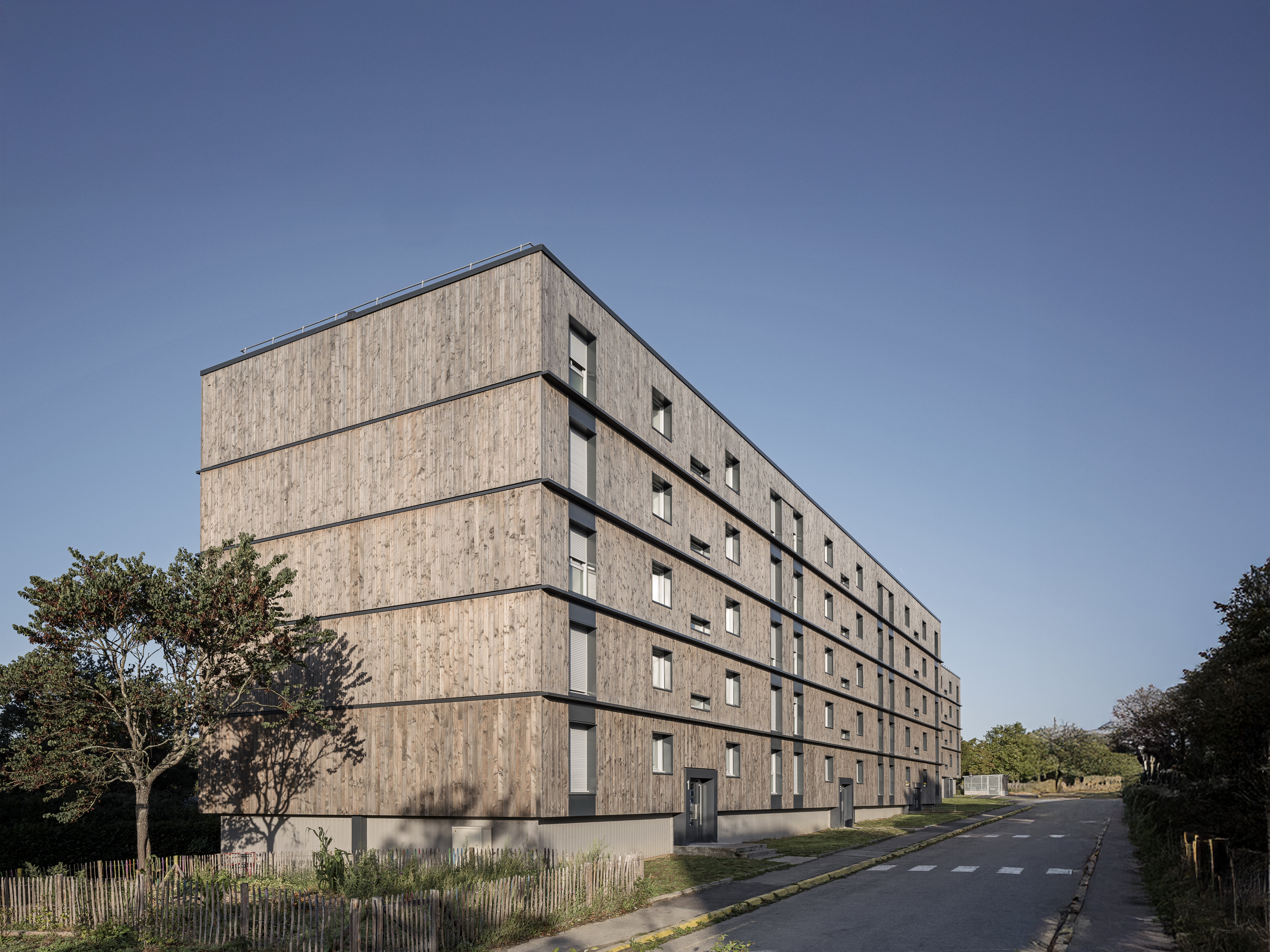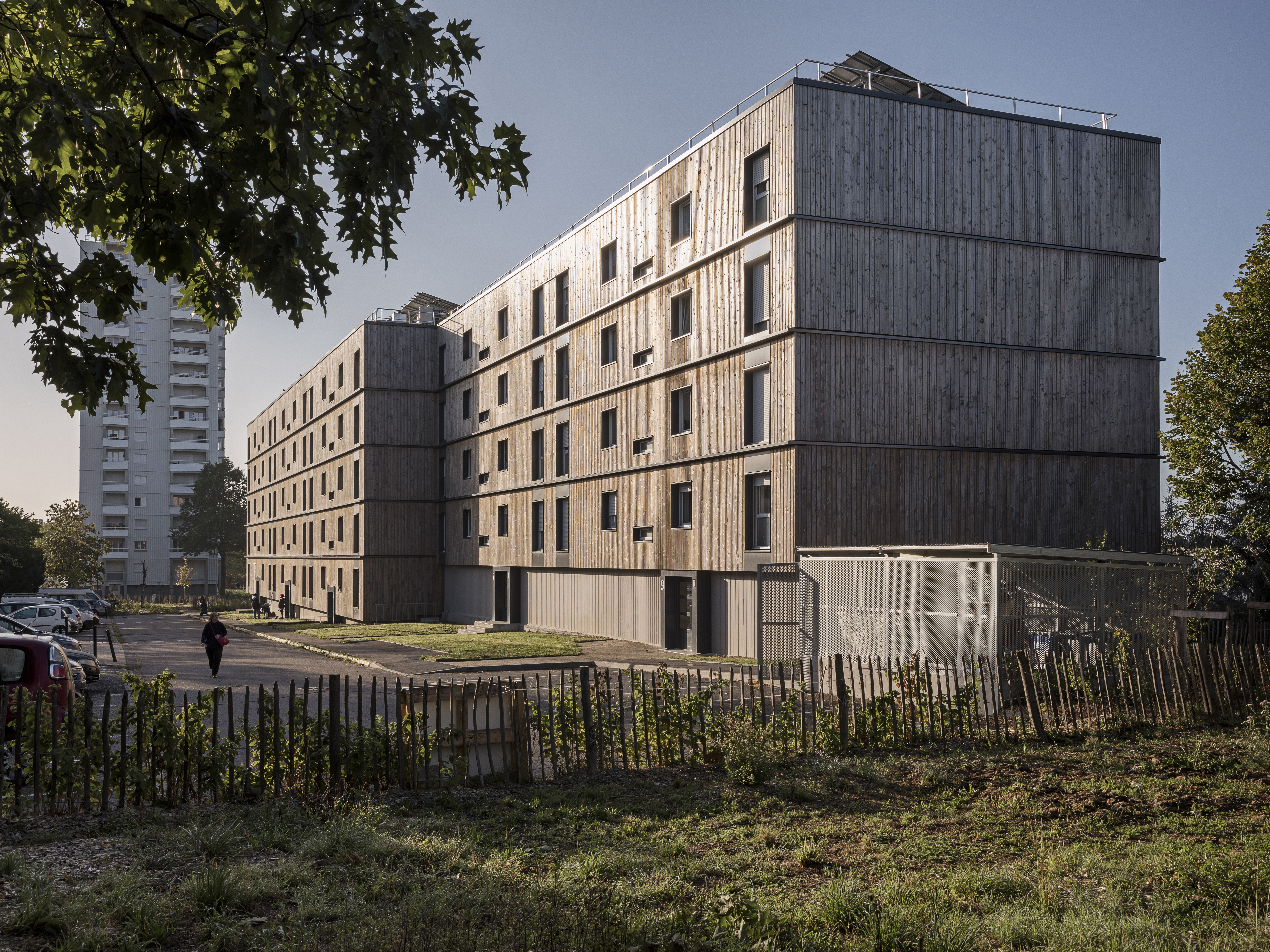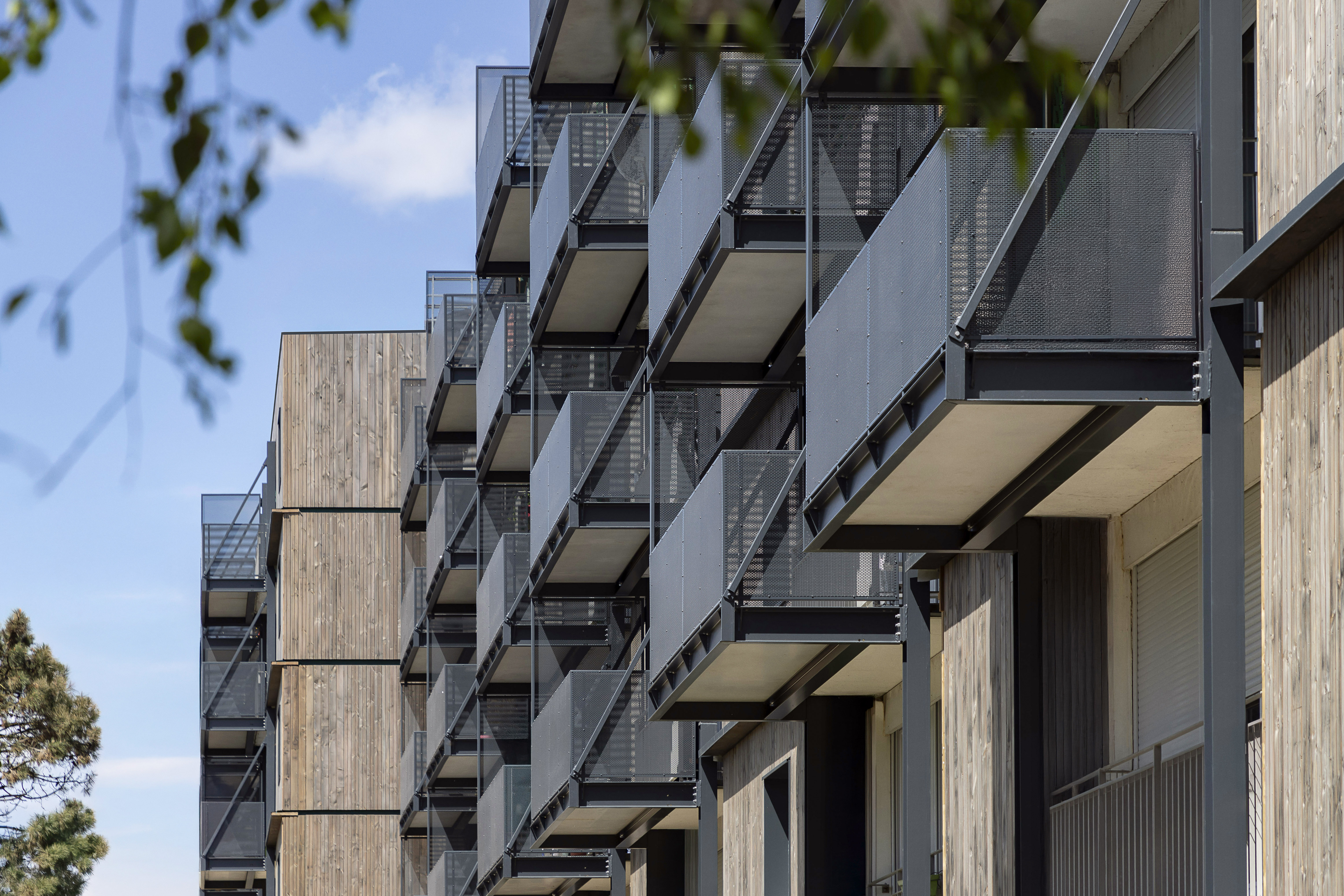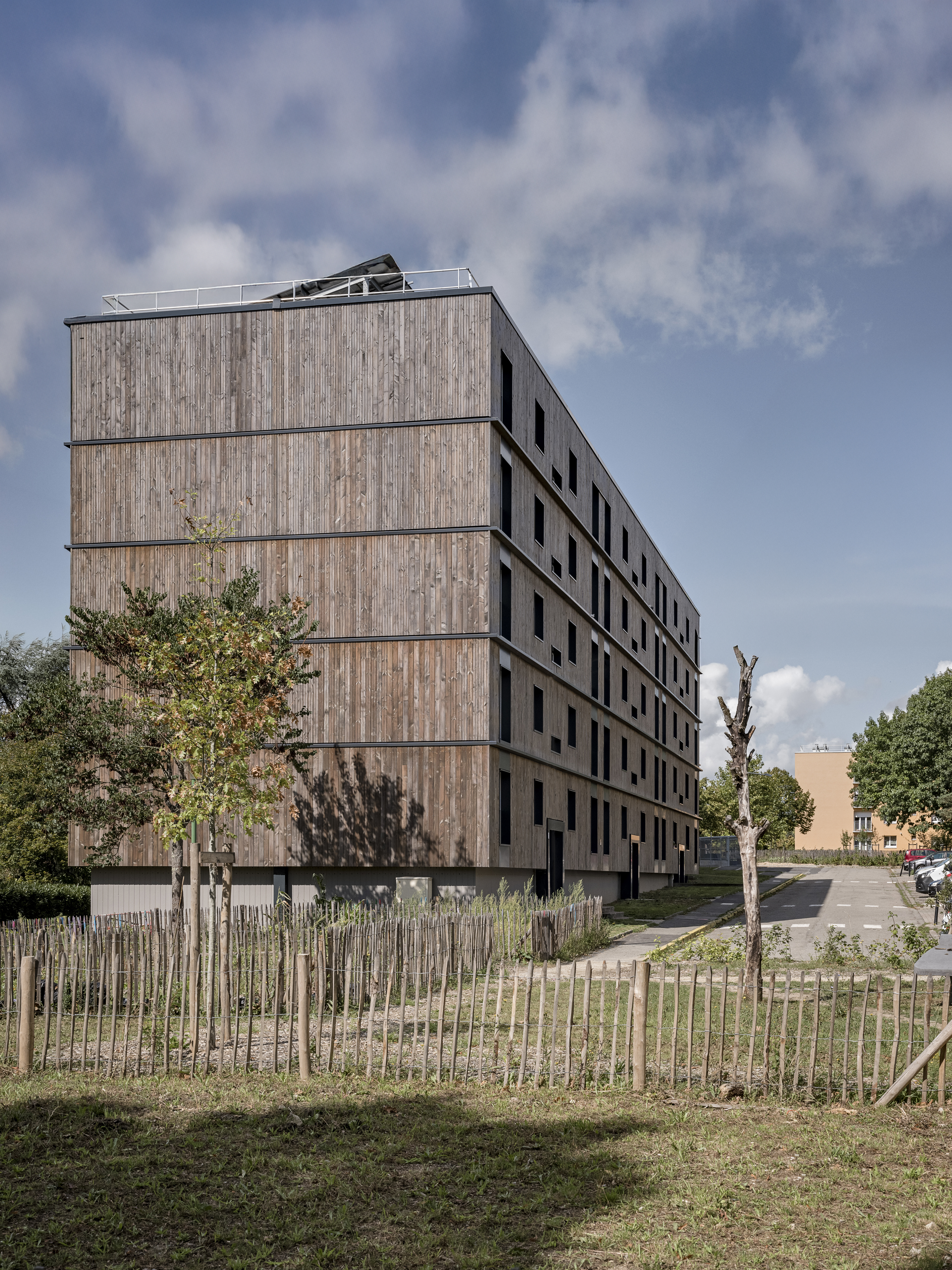 Le cadre arboré des bâtiments, incite à adopter une approche mettant en avant l’utilisation de matériaux biosourcés. Afin de pérenniser l’ensemble et d’éviter toutes dégradations, le socle du bâtiment est traité en peinture, ce qui diffère du corps du bâtiment, permettant d’ancrer le bâtiment dans son environnement urbain. Le projet compose avec l’horizontalité des bâtiments et la verticalité des trames des balcons. Les matériaux mis en œuvre respectent la réglementation de la sécurité incendie. L’horizontalité du bâti existant est rompue avec la pose du bardage bois à la vertical, disposé sur les Façades Ossature Bois.