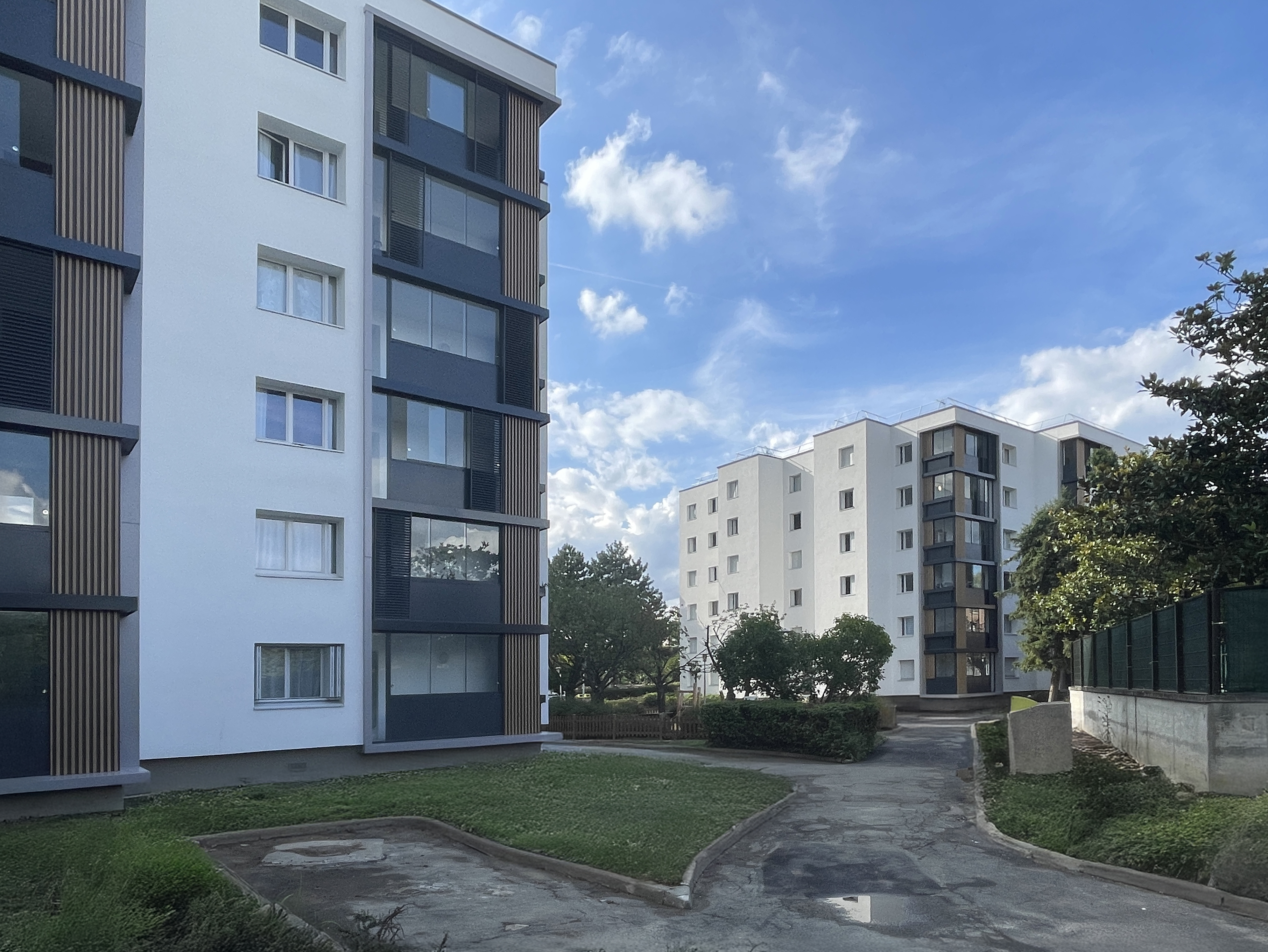 Le site fait l’objet d’une résidentialisation avec l’installation d’une clôture et d’un contrôle d’accès au niveau des portails et portillons. L’objectif est la réappropriation des espaces extérieurs par les locataires. Le projet intègre une redéfinition des espaces végétalisés et de l’air de jeu des enfants.