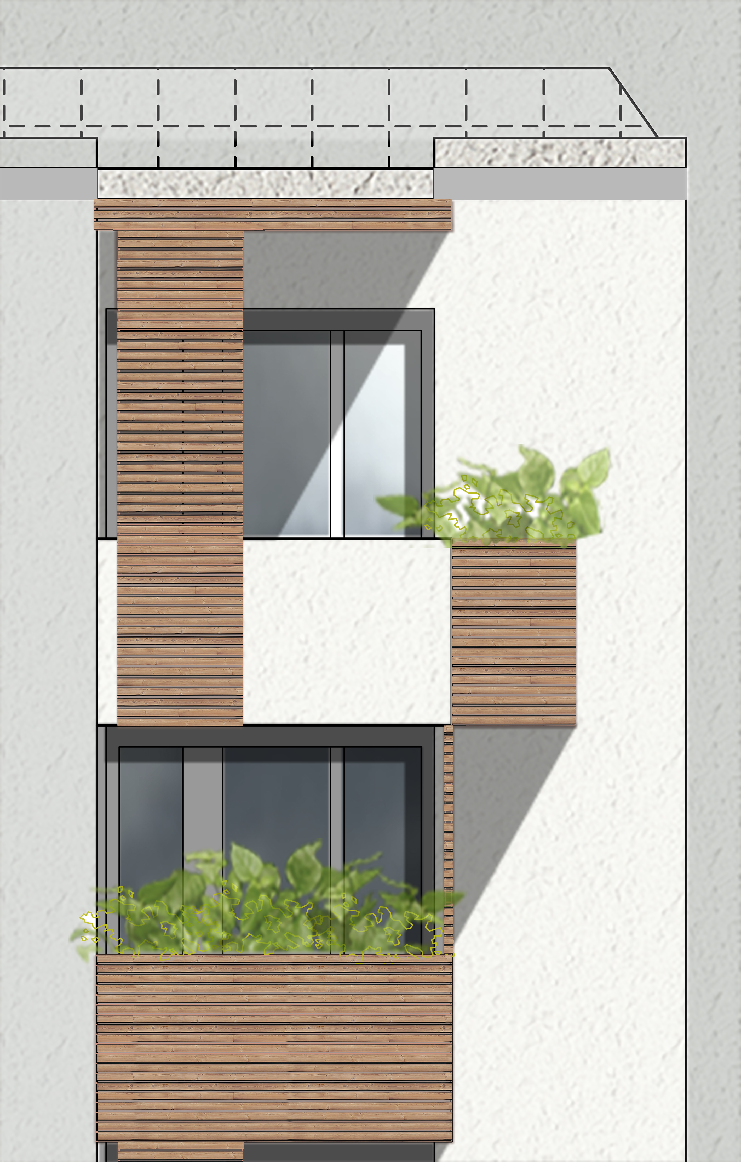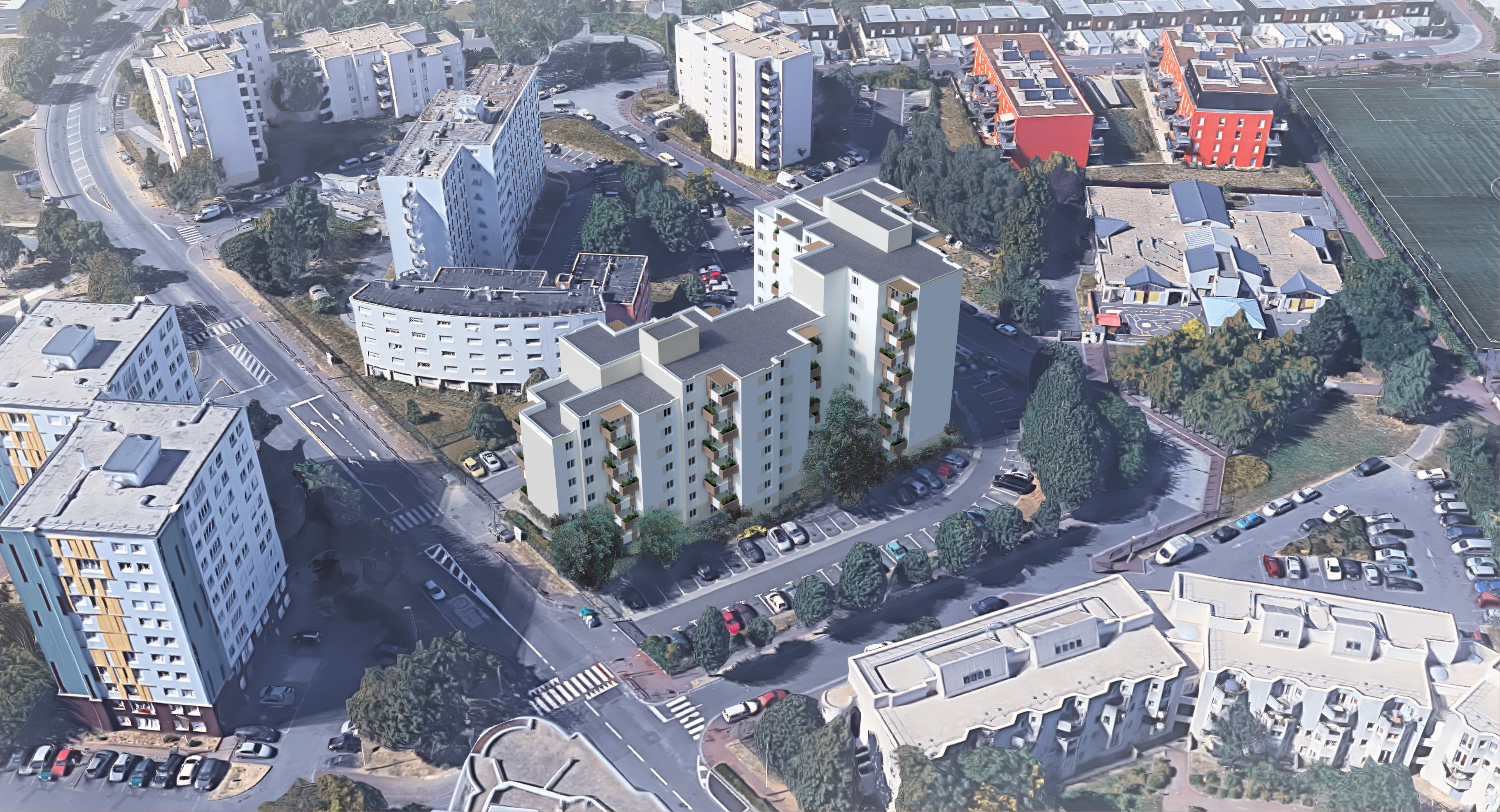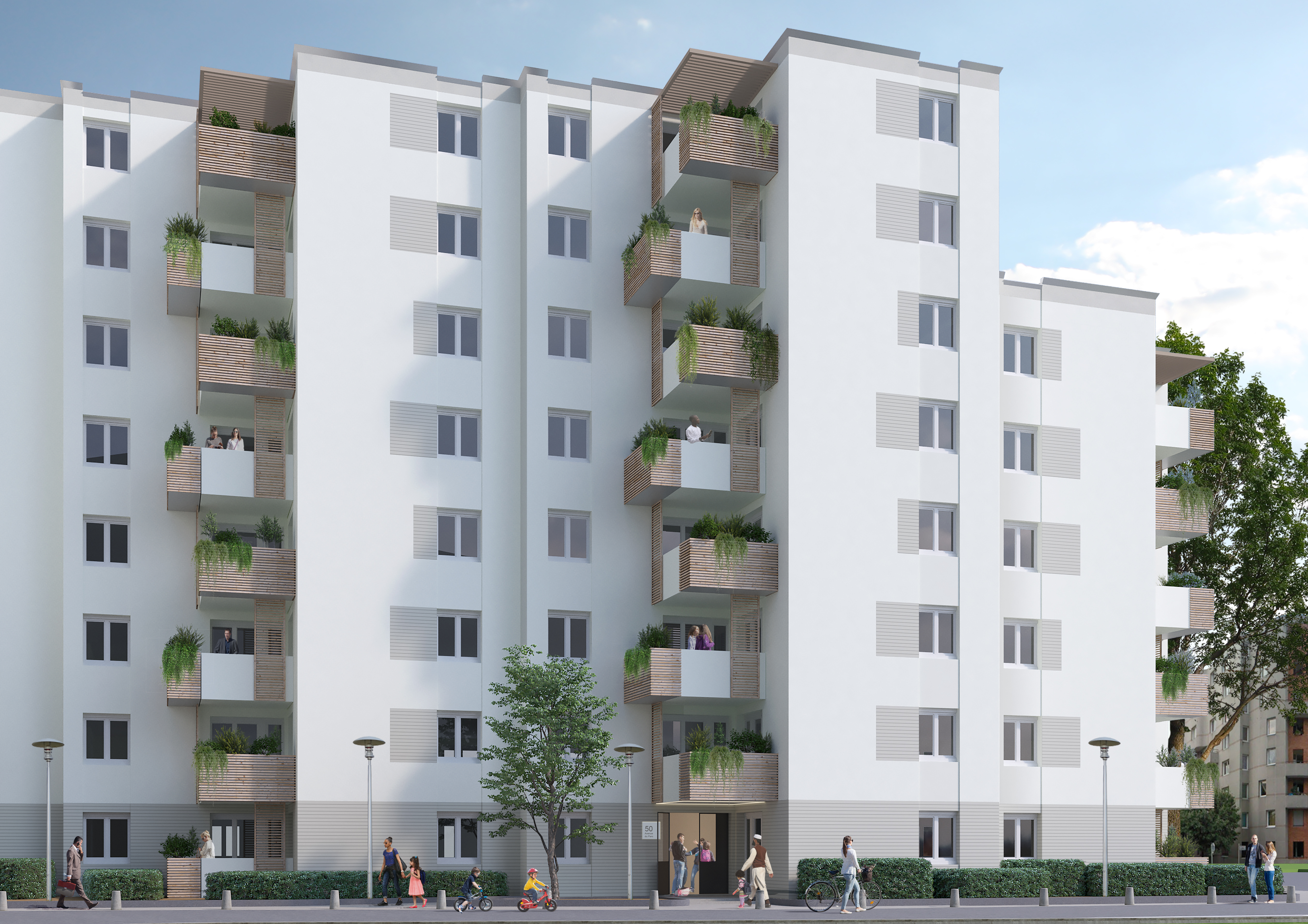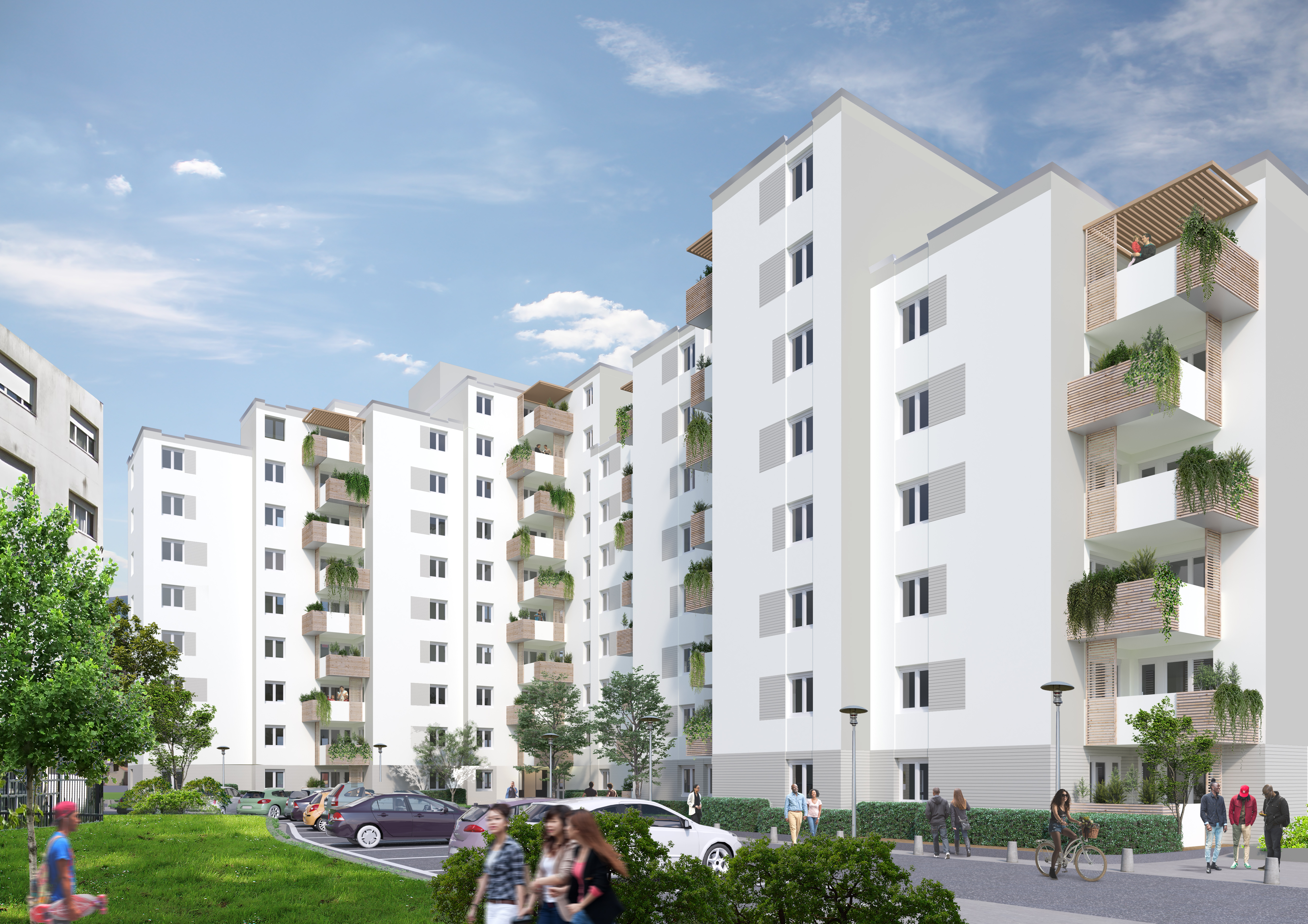 Notre intention est de faire exister cette composition de volumes, placés dans une situation urbaine complexe. L’ensemble doit prendre sa place dans ce contexte comme un signal. D’abord comme un signal constitué principalement par des façades expressives en mettant en scène les balcons, les entrées et les halls, mais aussi en créant des effets de socle et de rythme grâce au choix de finition d’enduits variés selon la localisation. Puis comme un objet faisant partie d’un tout harmonieux où les mouvements et les matières des balcons recomposés amènent une nouvelle identité et interprétation du groupe résidentiel.