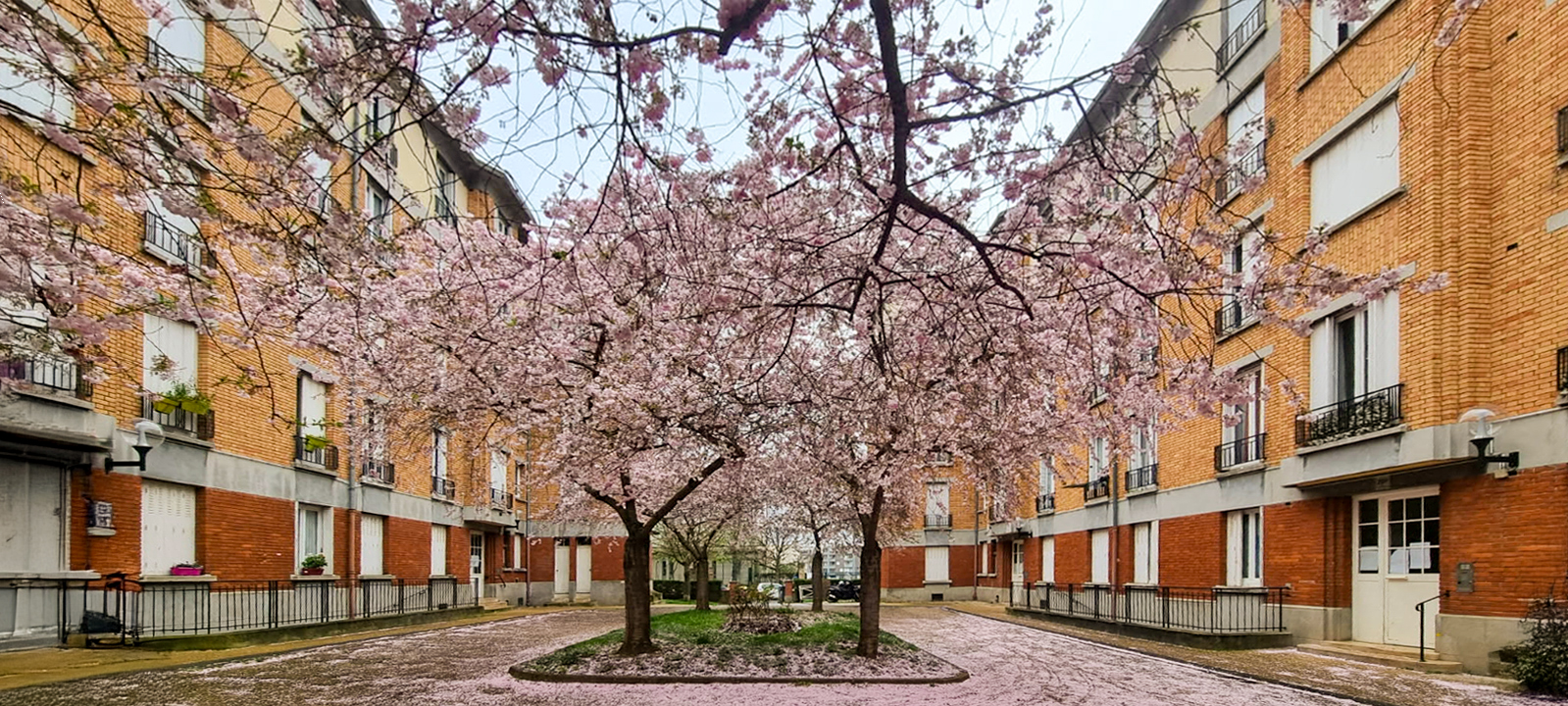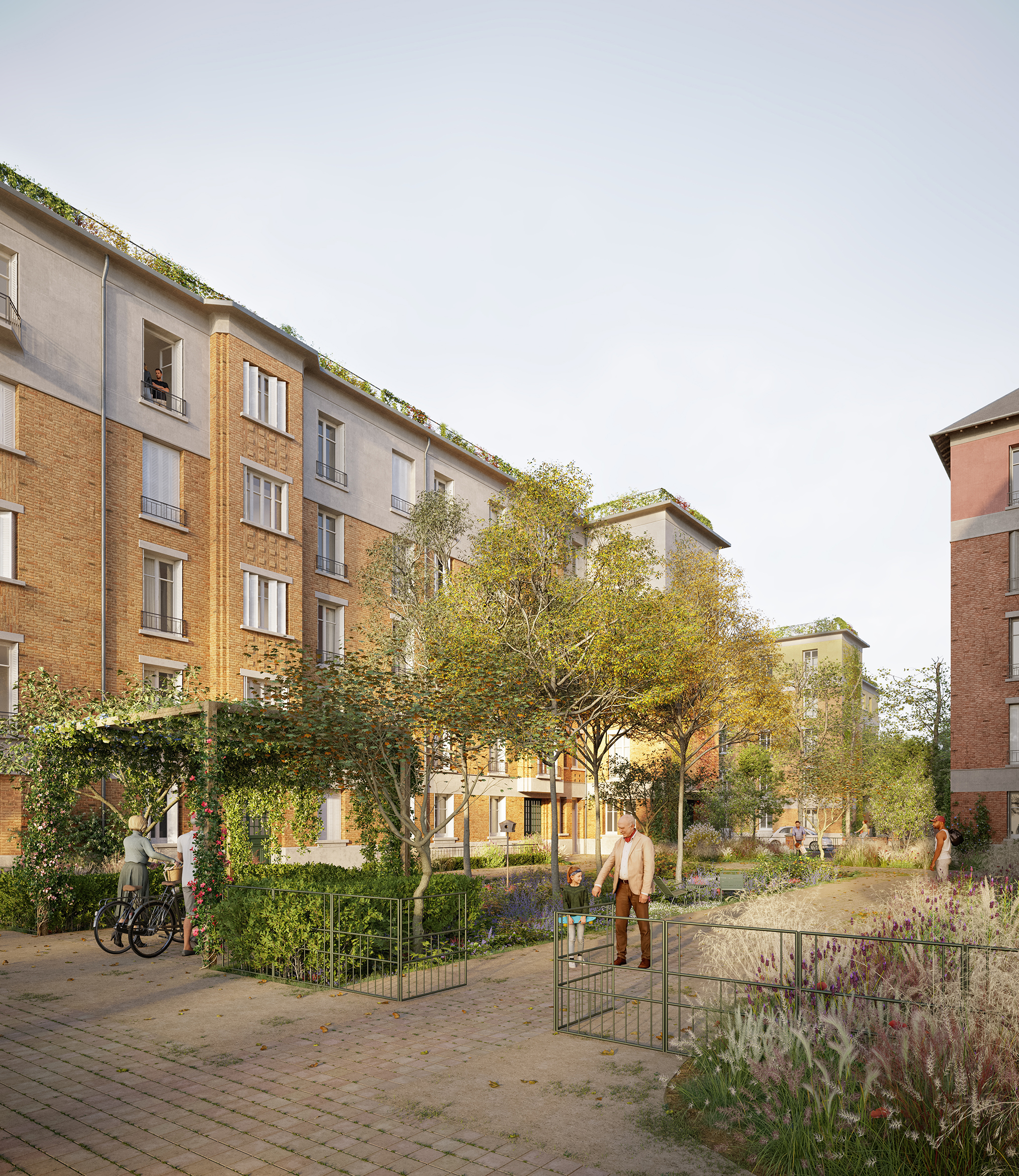Le projet paysager s’insère entre chaque bâtiment avec une valorisation et une densification du végétal, la création d’îlots de fraîcheur, la gestion des eaux pluviales et une désimperméabilisation des sols. Il est également lié à l’adaptation PMR avec un travail fin sur les cheminements piétons.