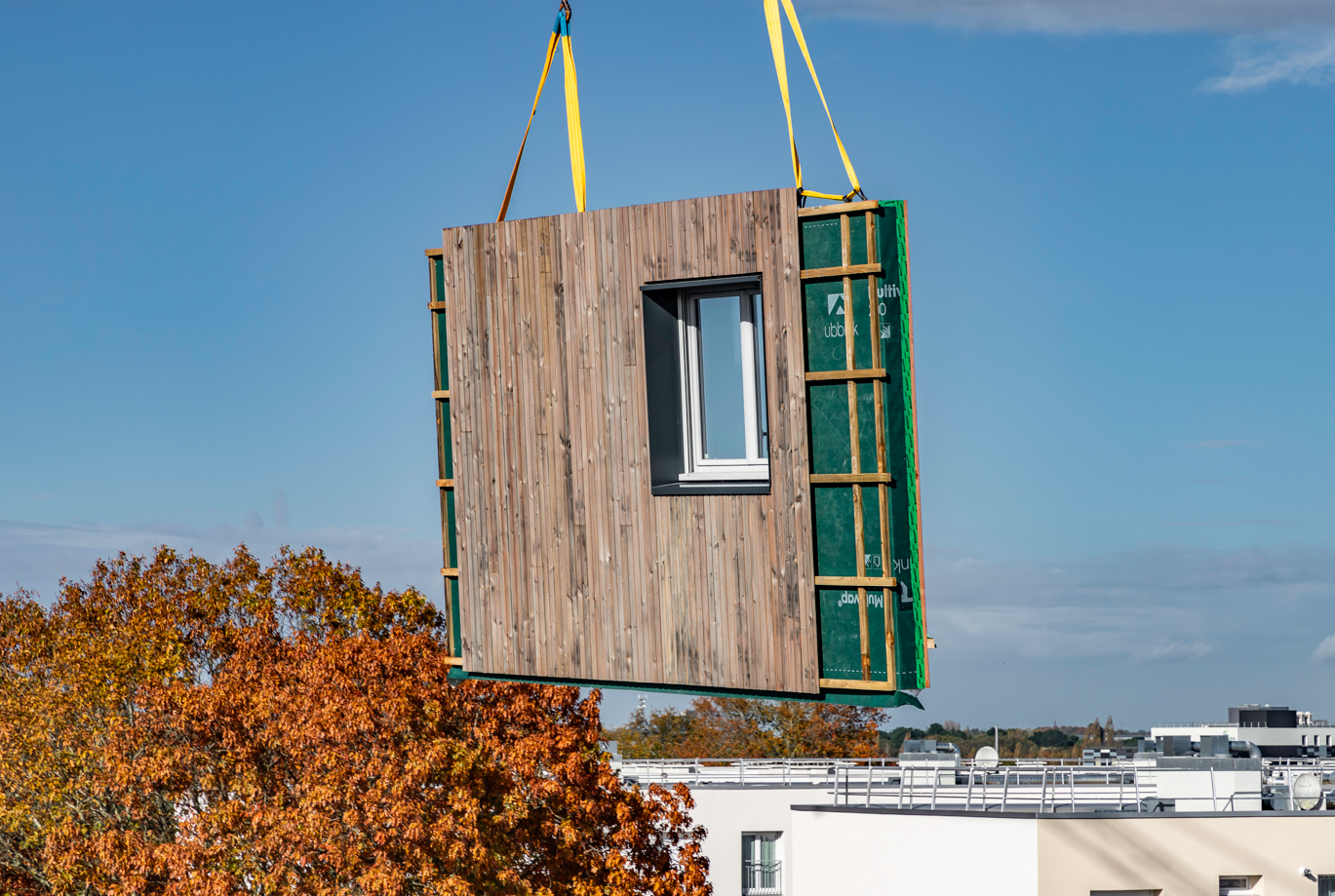 La mise en œuvre de Façade Ossature Bois est composée d’un revêtement en bardage bois, douglas, d’une isolation biosourcée en laine de bois. Les modules de façade, comprenant également les menuiseries extérieures et les éléments d’occultation, sont fabriqués HORS SITE, en usine, puis acheminés sur le chantier.