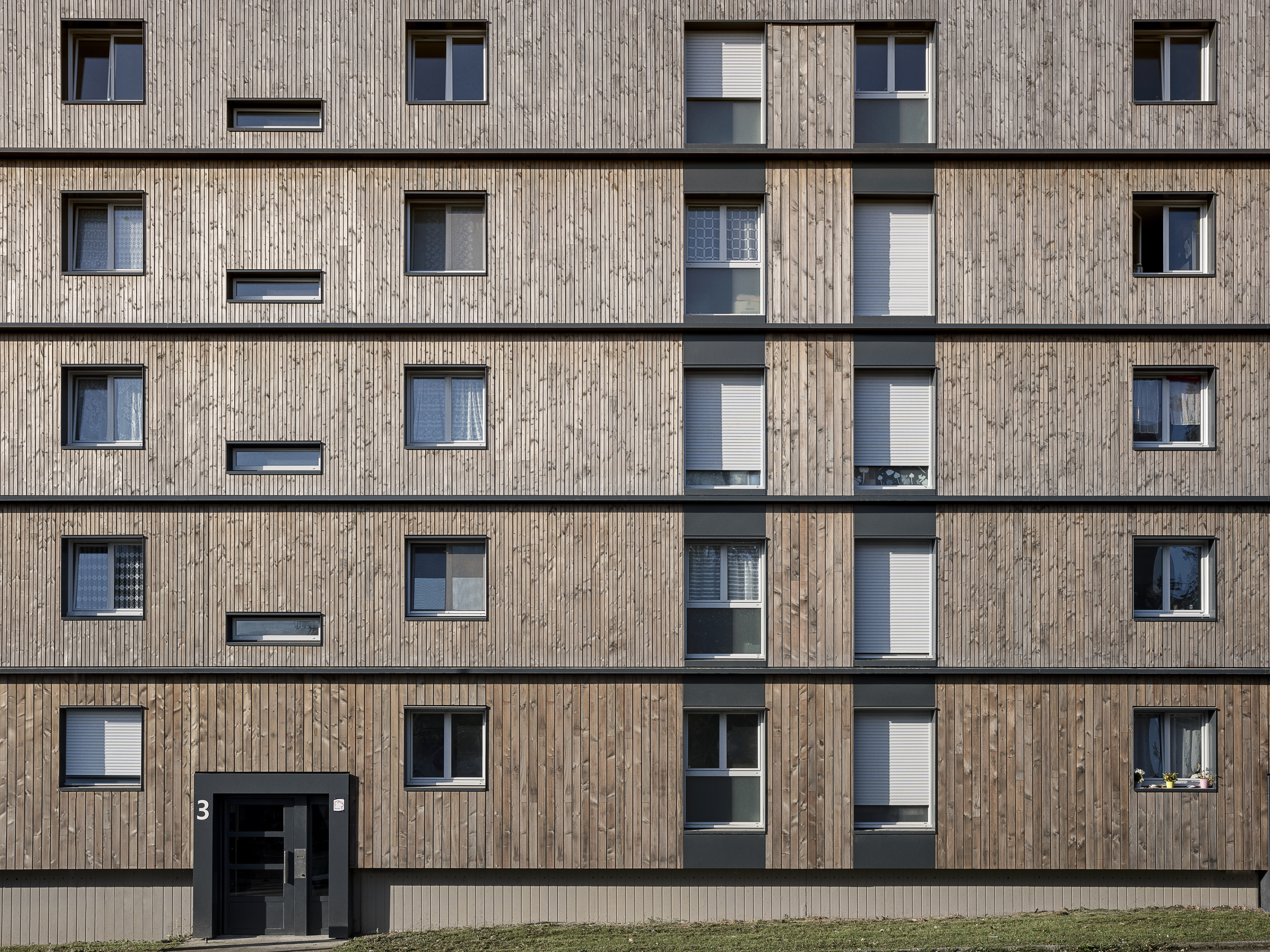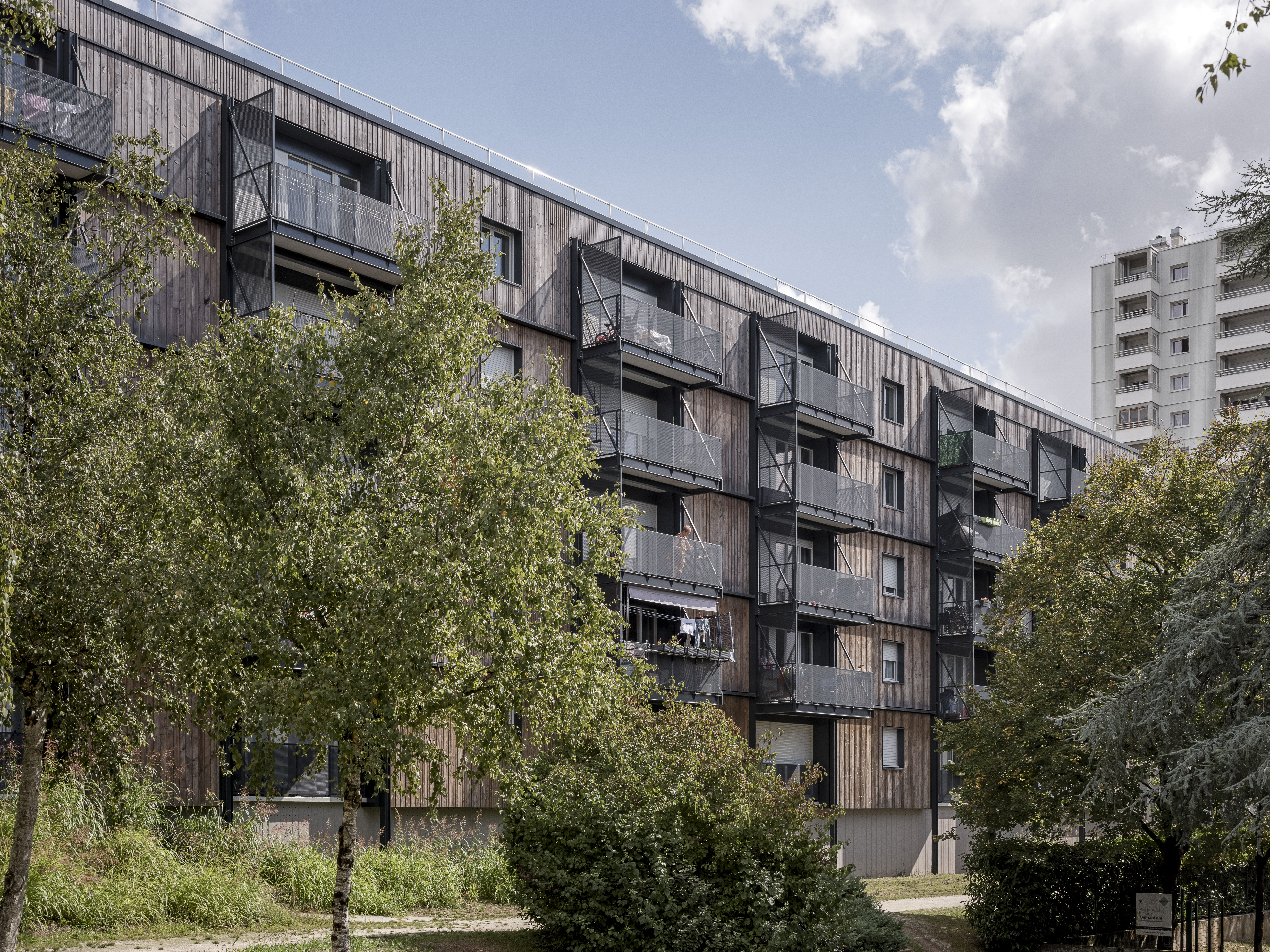 Le cadre arboré des bâtiments, incite à adopter une approche mettant en avant l’utilisation de matériaux biosourcés. Afin de pérenniser l’ensemble et d’éviter toutes dégradations, le socle du bâtiment est traité en peinture, ce qui diffère du corps du bâtiment, permettant d’ancrer le bâtiment dans son environnement urbain. Le projet compose avec l’horizontalité des bâtiments et la verticalité des trames des balcons. Les matériaux mis en œuvre respectent la réglementation de la sécurité incendie. L’horizontalité du bâti existant est rompue avec la pose du bardage bois à la vertical, disposé sur les Façades Ossature Bois.