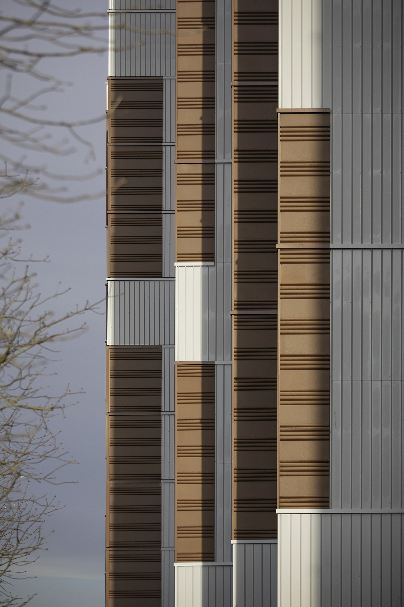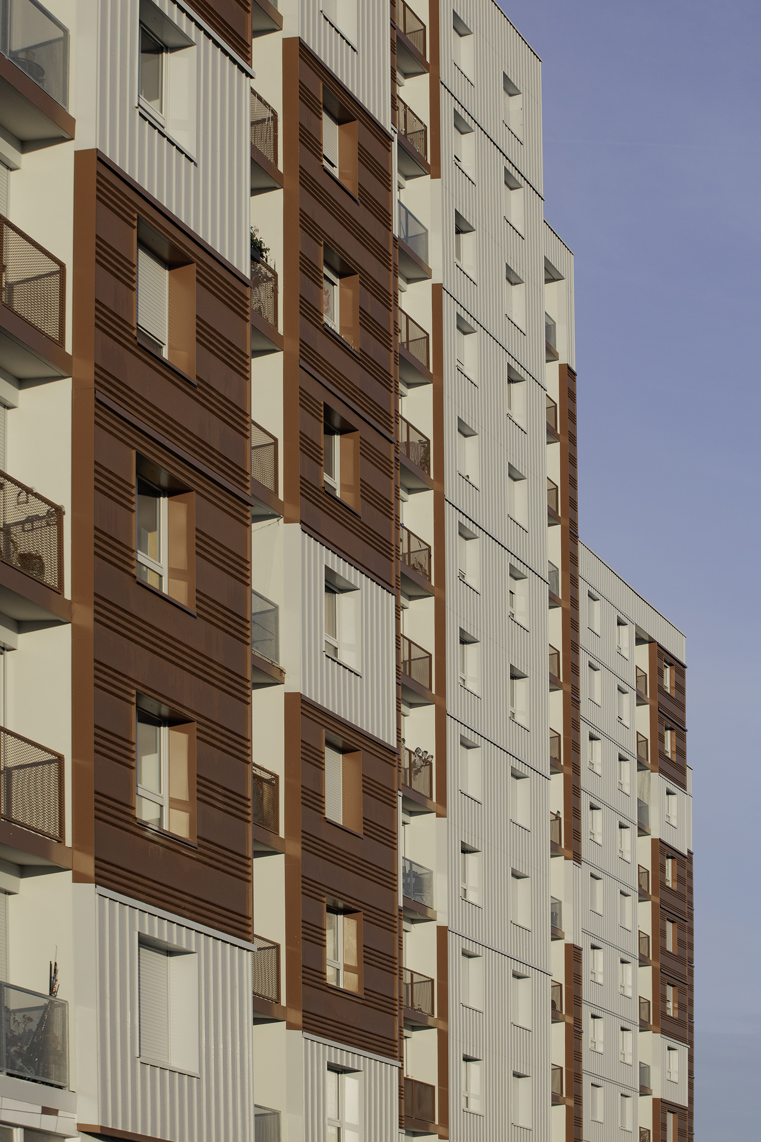 Le projet compose avec la verticalité des tours et l’horizontalité des trames des loggias. Les matériaux mis en œuvre respectent la réglementation d’un Immeuble Moyen Hauteur (IMH). Le bardage utilisé sur la façade à ossature bois (FOB) est constitué de plaques de bac acier qui mettent en avant soit la verticalité, soit l’horizontalité. L’utilisation des textures et des teintes variées permet de mettre en évidence les différents éléments architecturaux et de créer une impression de relief.