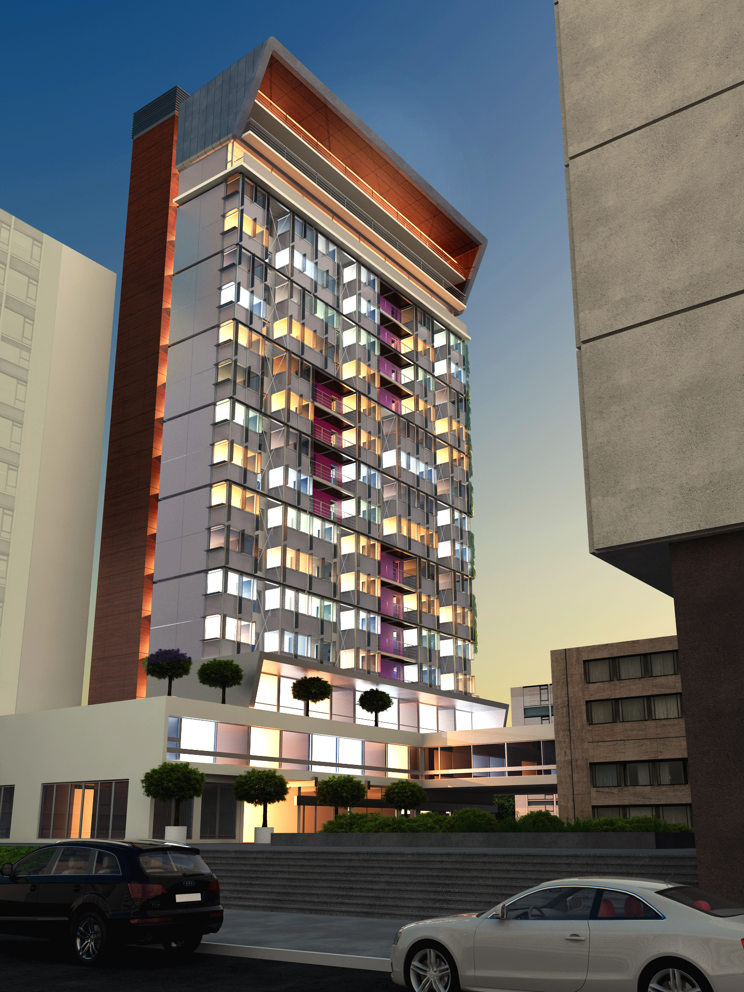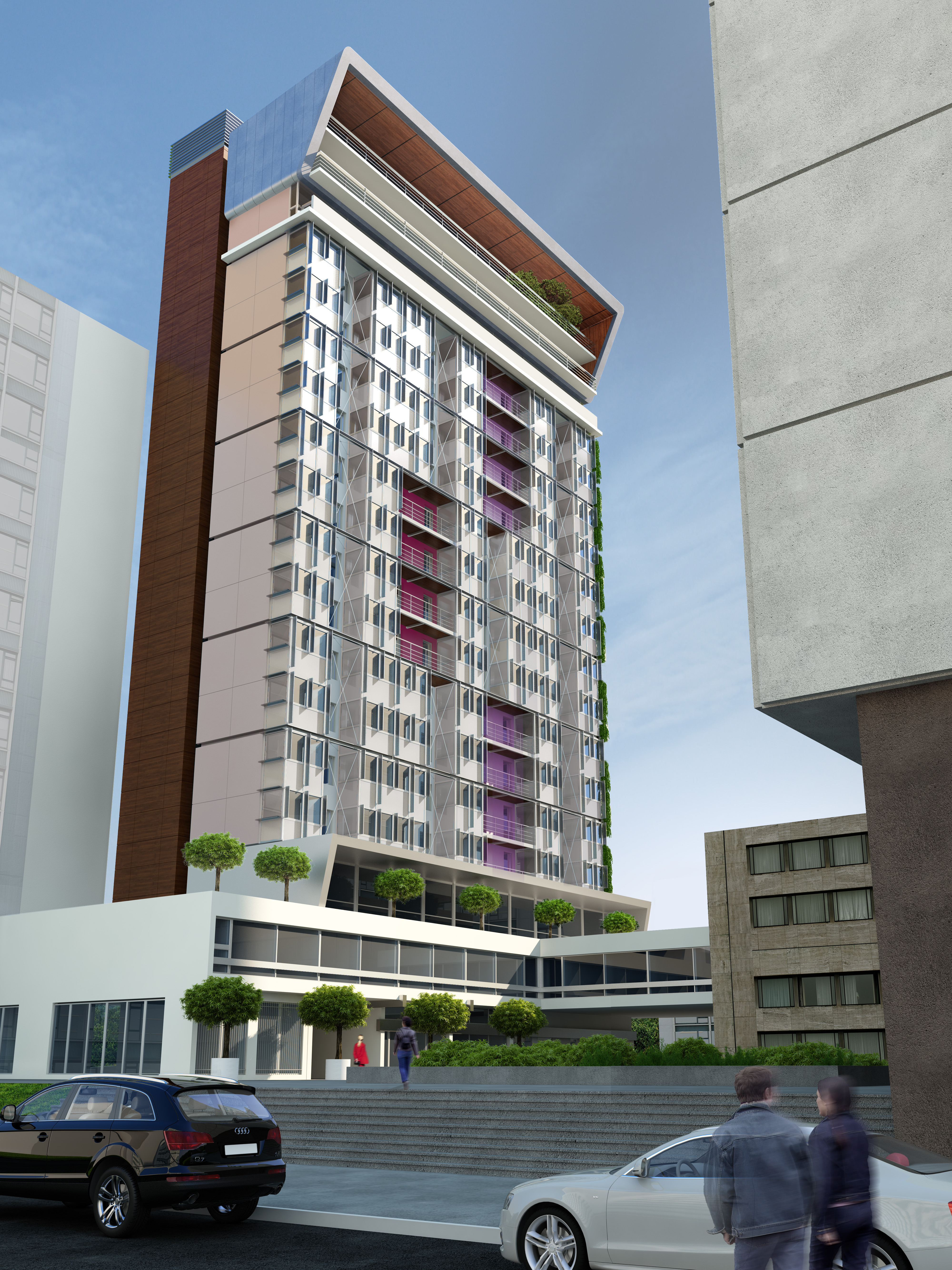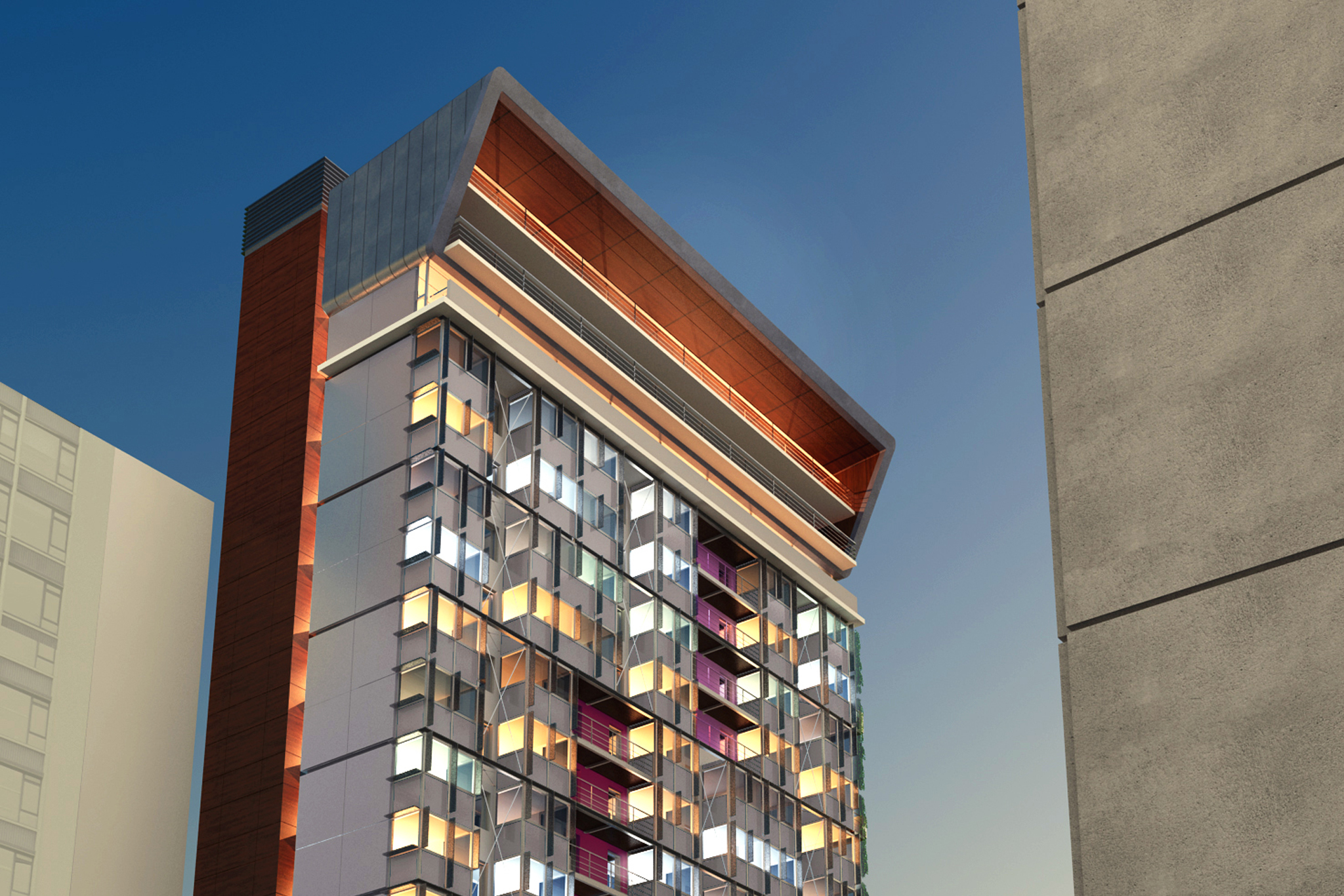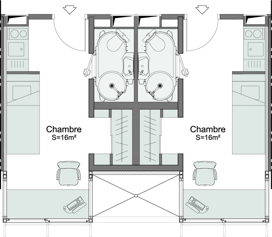 La création de trois niveaux en surélévation des tours fait passer ces dernières de 45m à 50m. L’extension en façade permettent d’augmenter la surface des chambres de 9m² à 16m² améliorant ainsi le confort des occupants.