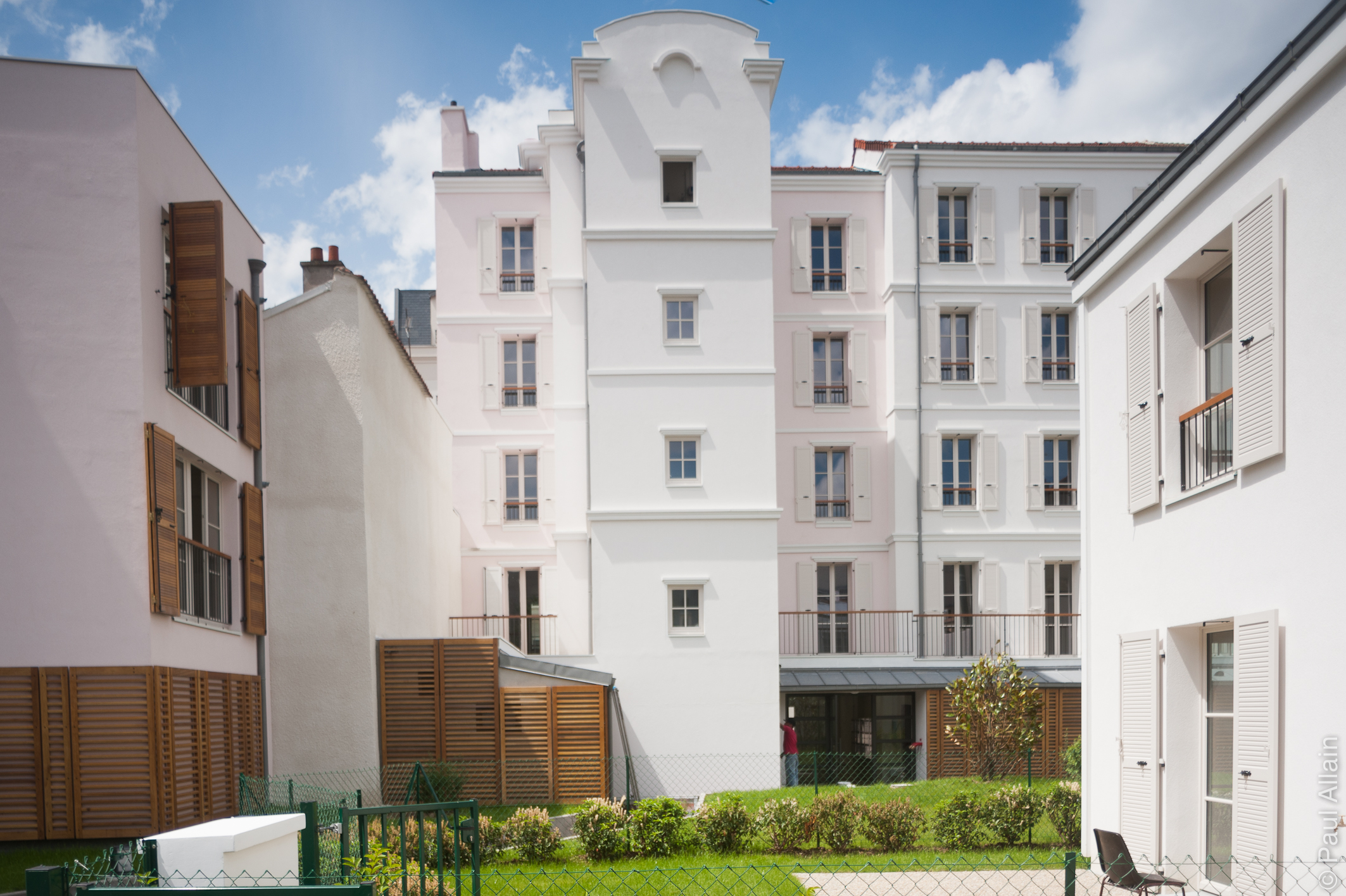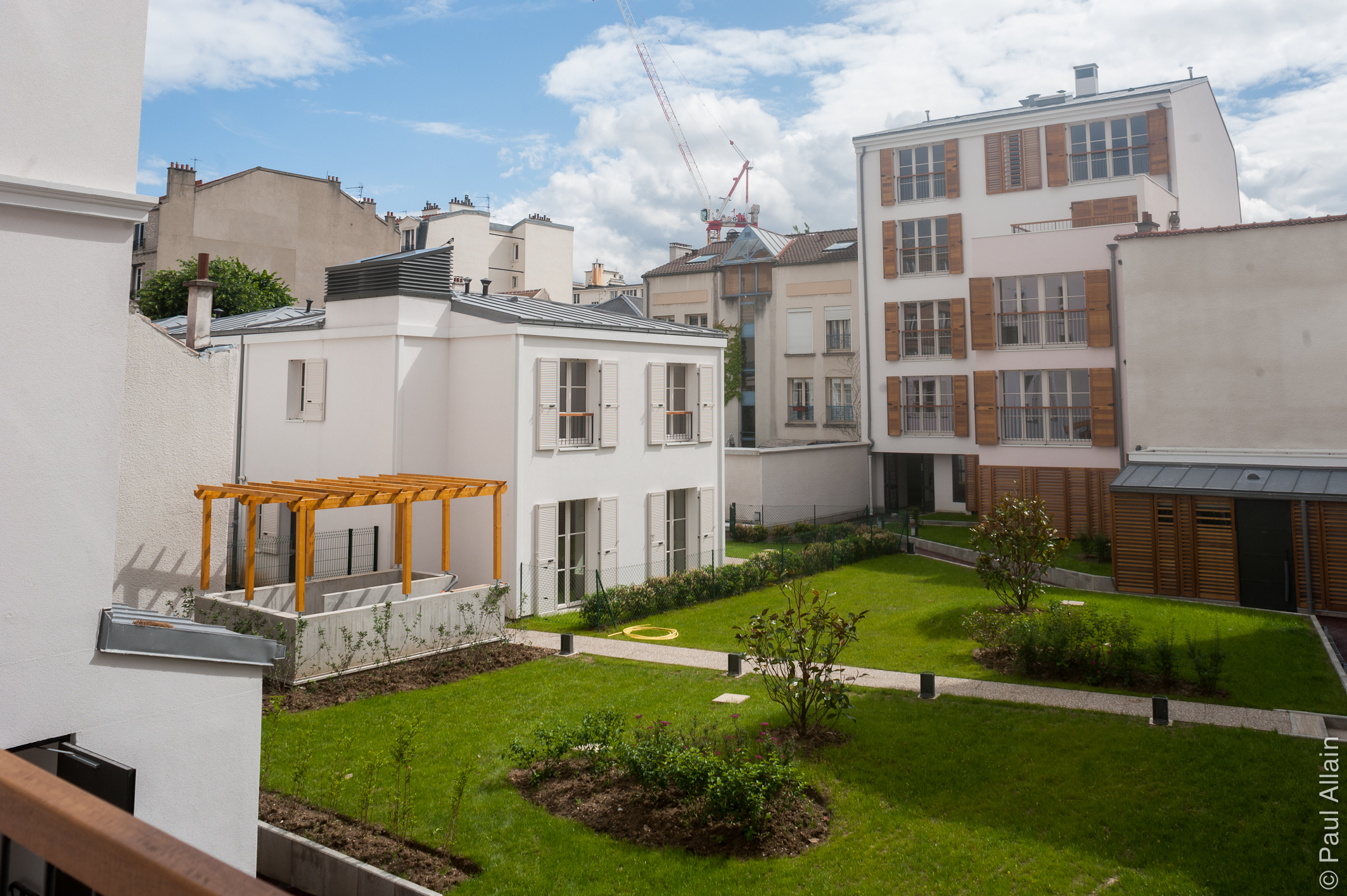 L’opération dans son ensemble concerne 35 Logements sociaux en accession à la propriété. 24 logements sont à réhabiliter, des balcons sont créés en façade ainsi que des commerces en rez-de-chaussée. Un immeuble neuf de 7 logements est construit ainsi que 4 maisons individuelles en fond de parcelle. Un jardin est aménagé en cœur d’îlot et un parking souterrain est créé.