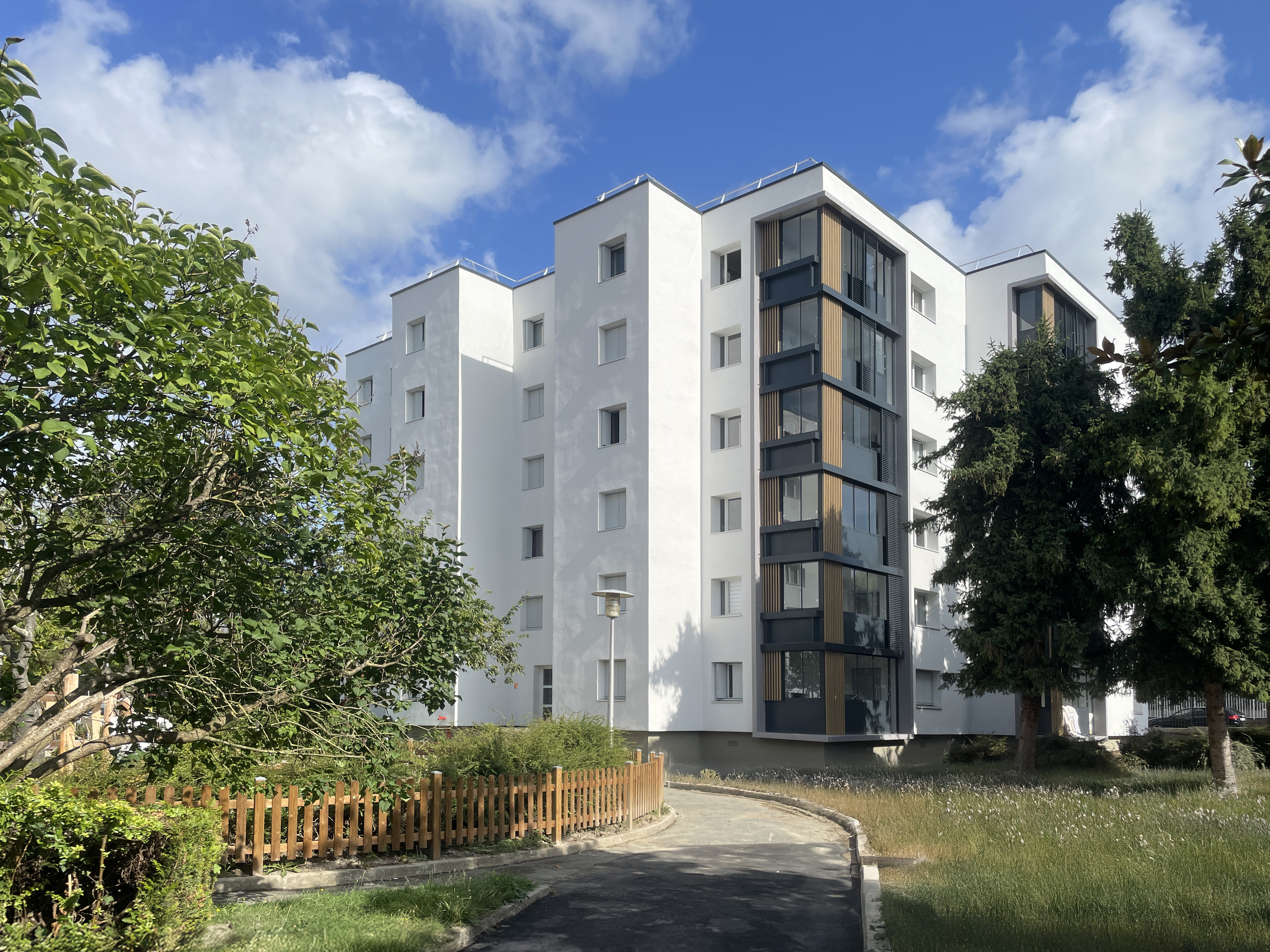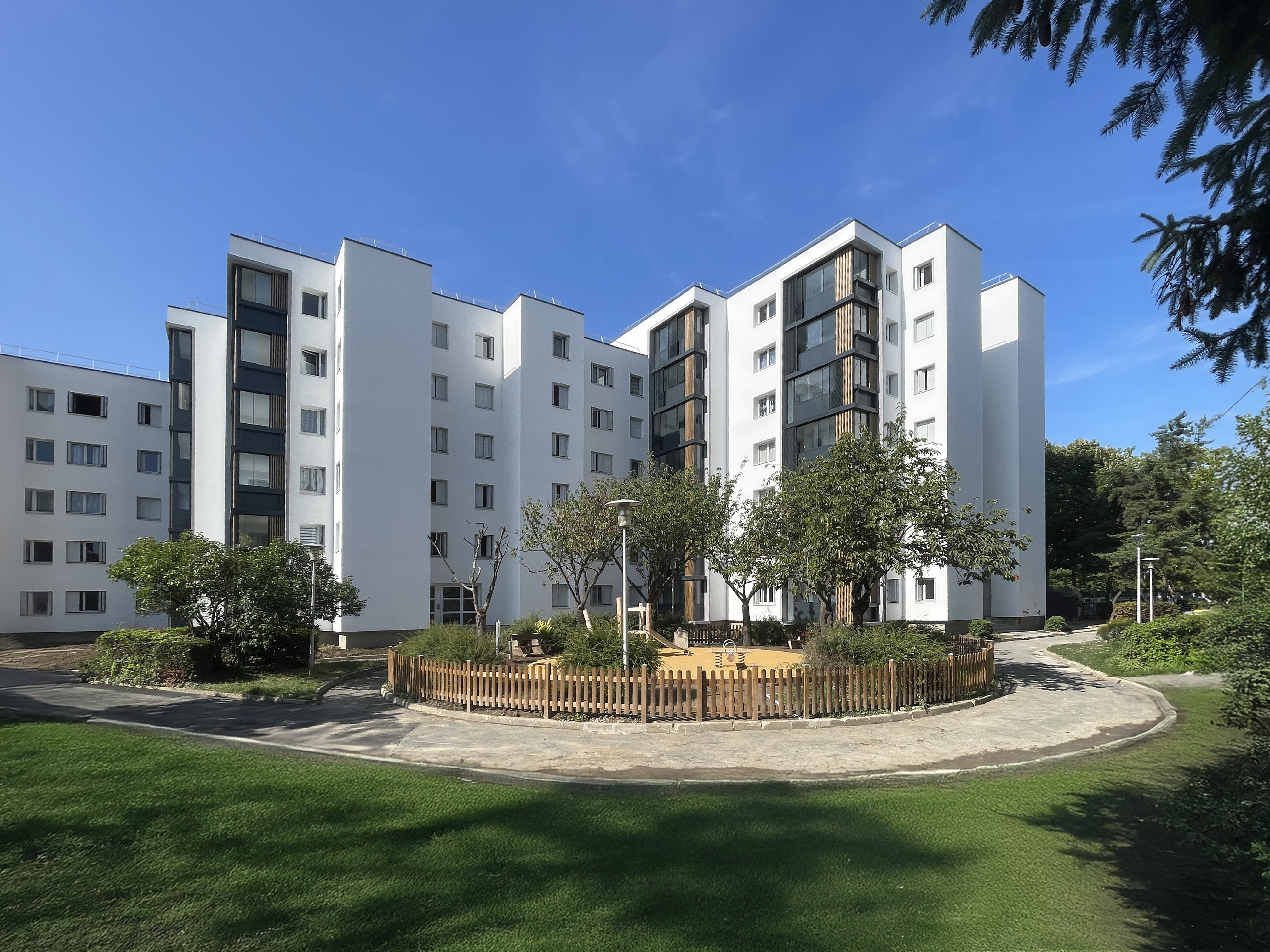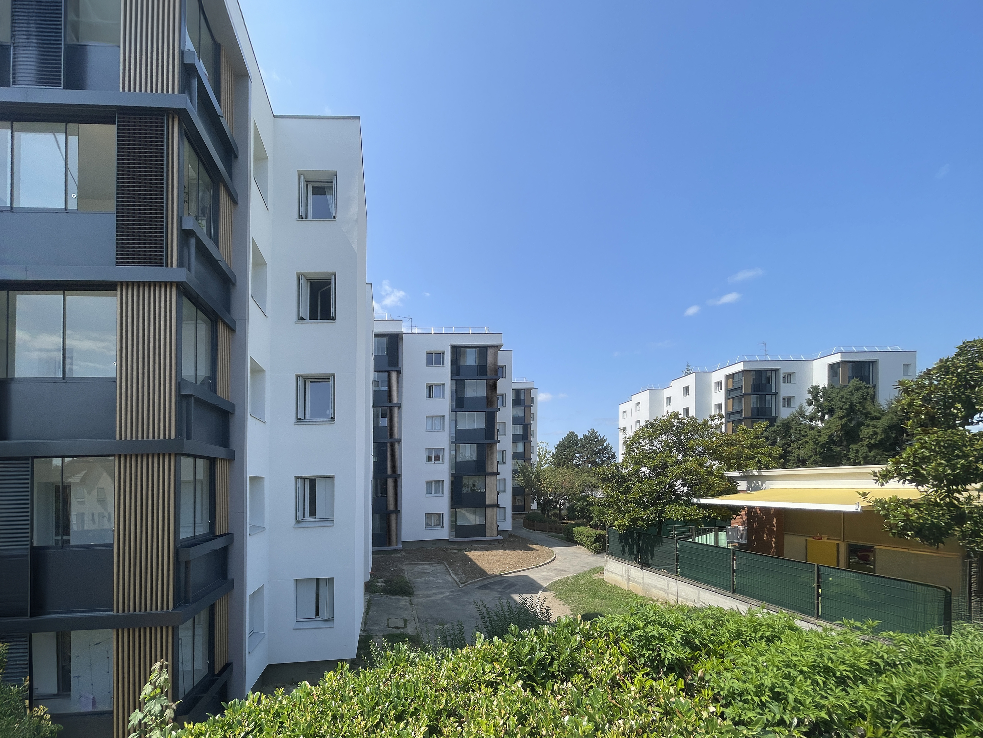Le site fait l’objet d’une résidentialisation avec l’installation d’une clôture et d’un contrôle d’accès au niveau des portails et portillons. L’objectif est la réappropriation des espaces extérieurs par les locataires. Le projet intègre une redéfinition des espaces végétalisés et de l’air de jeu des enfants.