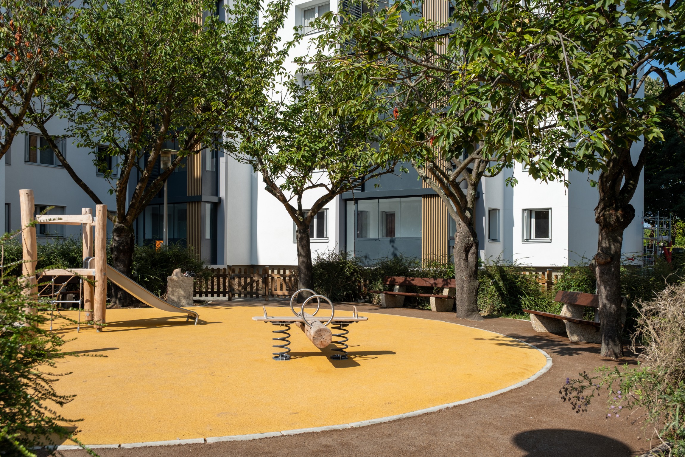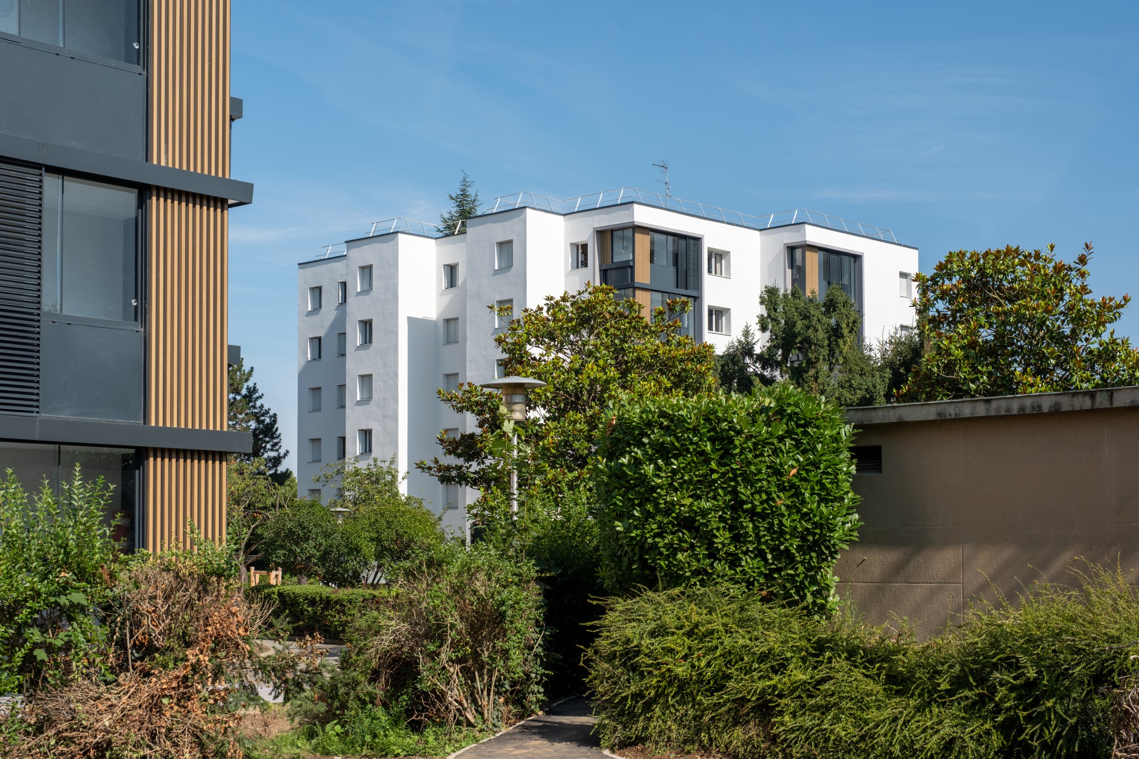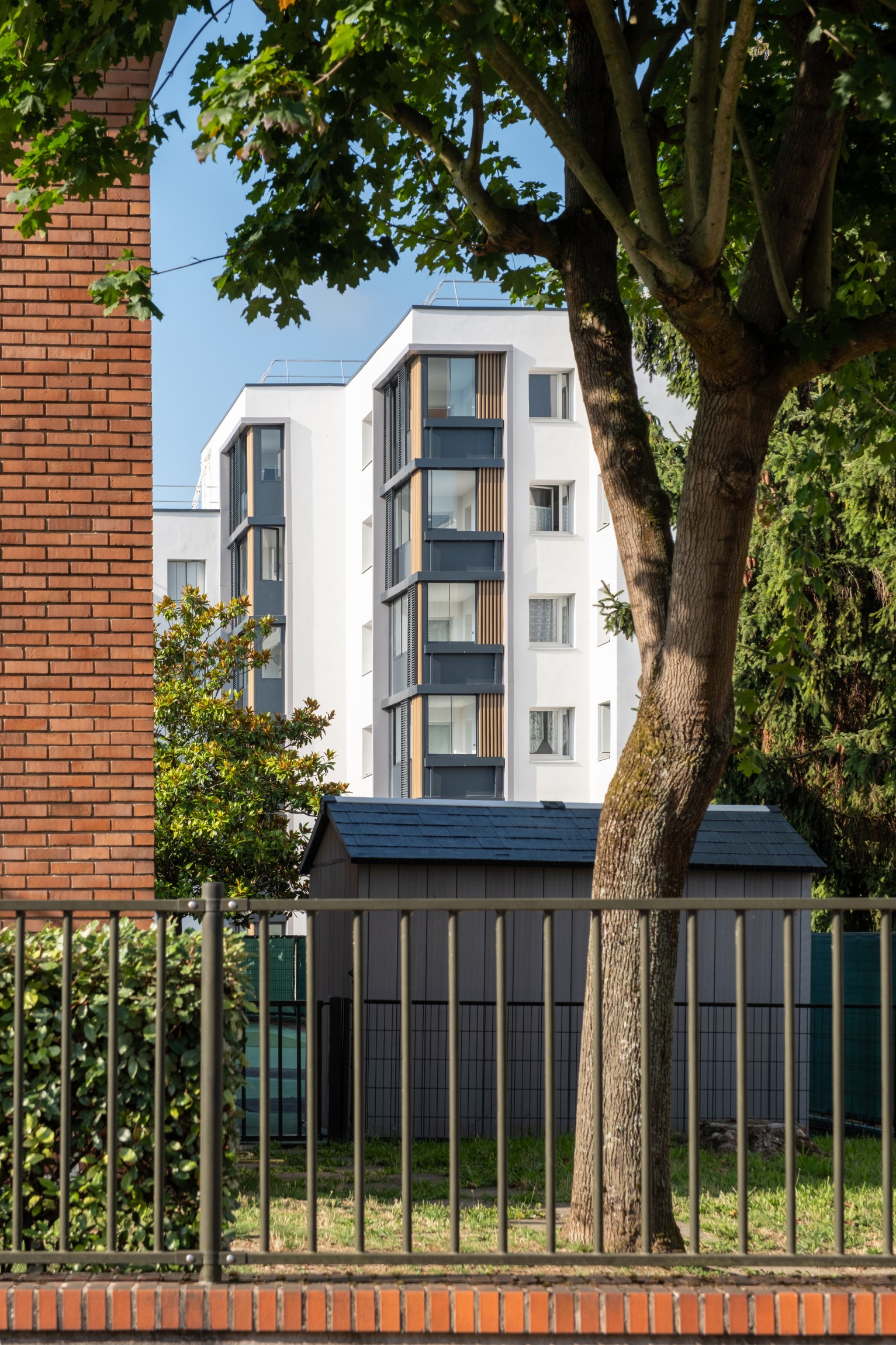 Le site fait l’objet d’une résidentialisation avec l’installation d’une clôture et d’un contrôle d’accès au niveau des portails et portillons. L’objectif est la réappropriation des espaces extérieurs par les locataires. Le projet intègre une redéfinition des espaces végétalisés et de l’air de jeu des enfants.