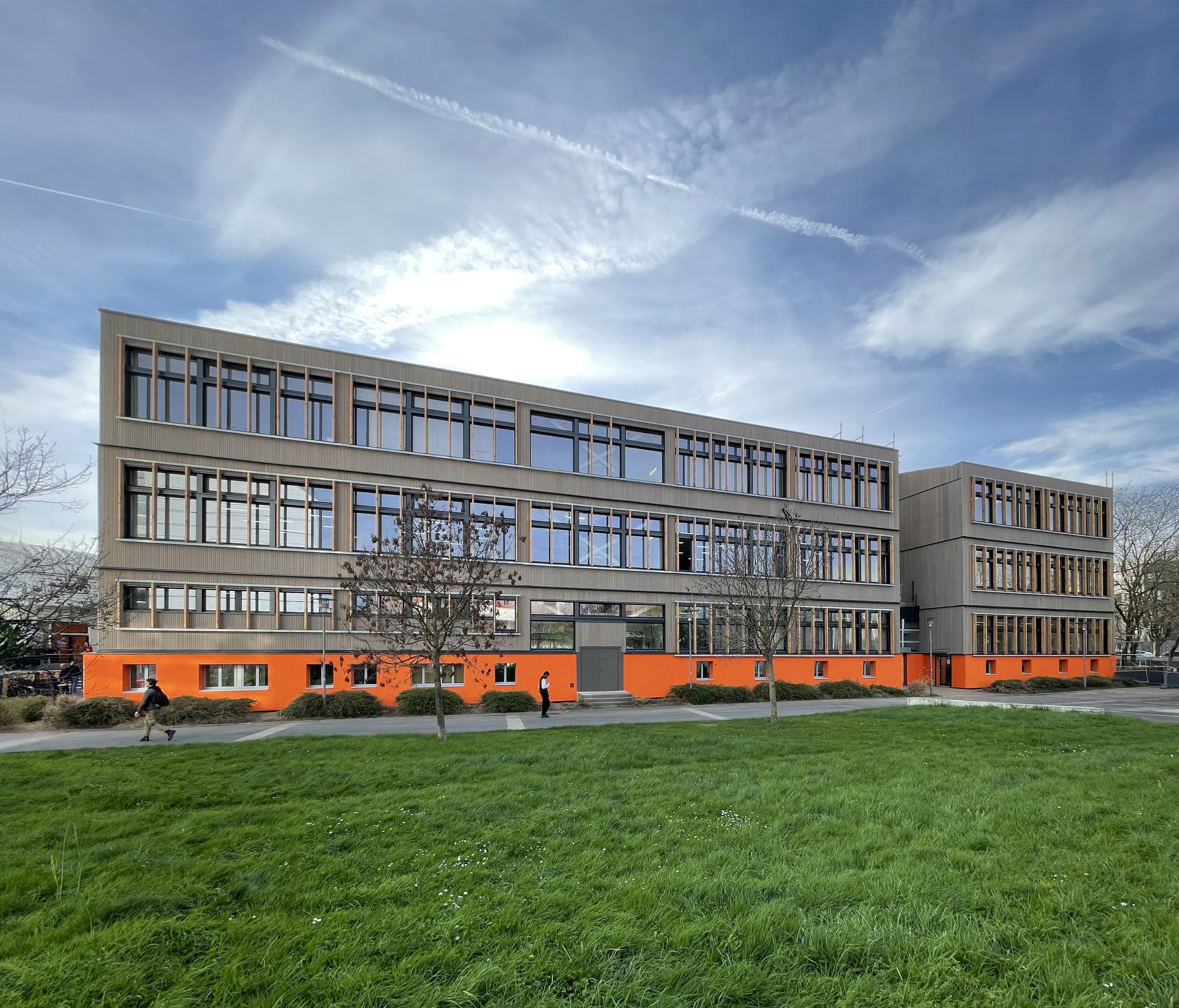 Les matériaux, le procédé de fabrication et les coloris rappellent l’aspect existant (construction 1991-92 procédé de préfabrication avec charpente métallique et bardage métallique) tout en les adaptant aux contraintes actuelles visant à minimiser l’impact carbone au maximum. Le projet devrait permettre de réduire les consommations de plus de 60% grâce à l’enveloppe performante, le traitement passif des déperditions et des apports solaires, et aux installations techniques (ventilation double flux) etc. L’installation de panneaux photovoltaïques devrait permettre de rester sur une dépense d’énergie nulle sur les 30 prochaines années.